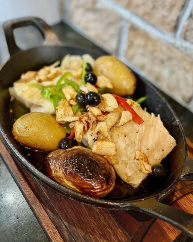 Uma boa pedida é o Bacalhau à Lagareiro, um dos maiores clássicos da gastronomia portuguesa. Preparado com uma posta de bacalhau grelhado (600g), é servido com batatas ao murro, pimentões, azeitonas e cebolas assadas, finalizado com azeite e alho dourado. Um prato tradicional, pensado para ser partilhado e saboreado a dois. Custa R$ 268,00.
