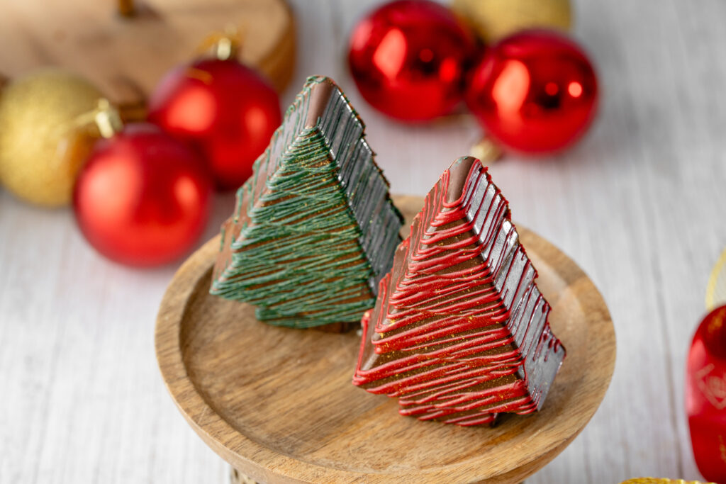 Pinheiros de chocolate ao leite recheados de brownie e brigadeiro ou brownie com caramelo salé. R$ 19,90.