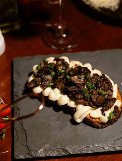 - Bruscheta de cogumelo (R$ 53): Pão italiano rústico tostado na chapa, catupiry,cogumelos