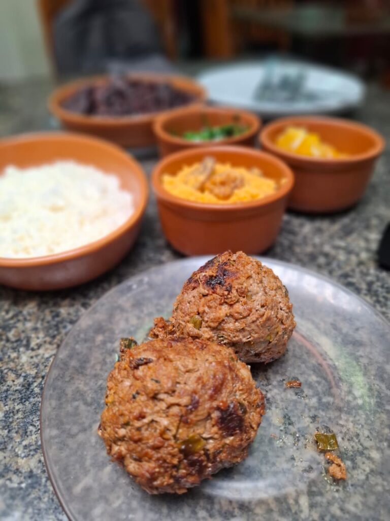 Uma pedida que não pode faltar são as bolas de carne, famosas e cheias de sabor. A unidade é R$ 12, cheias de tempero e com um toque especial da casa.