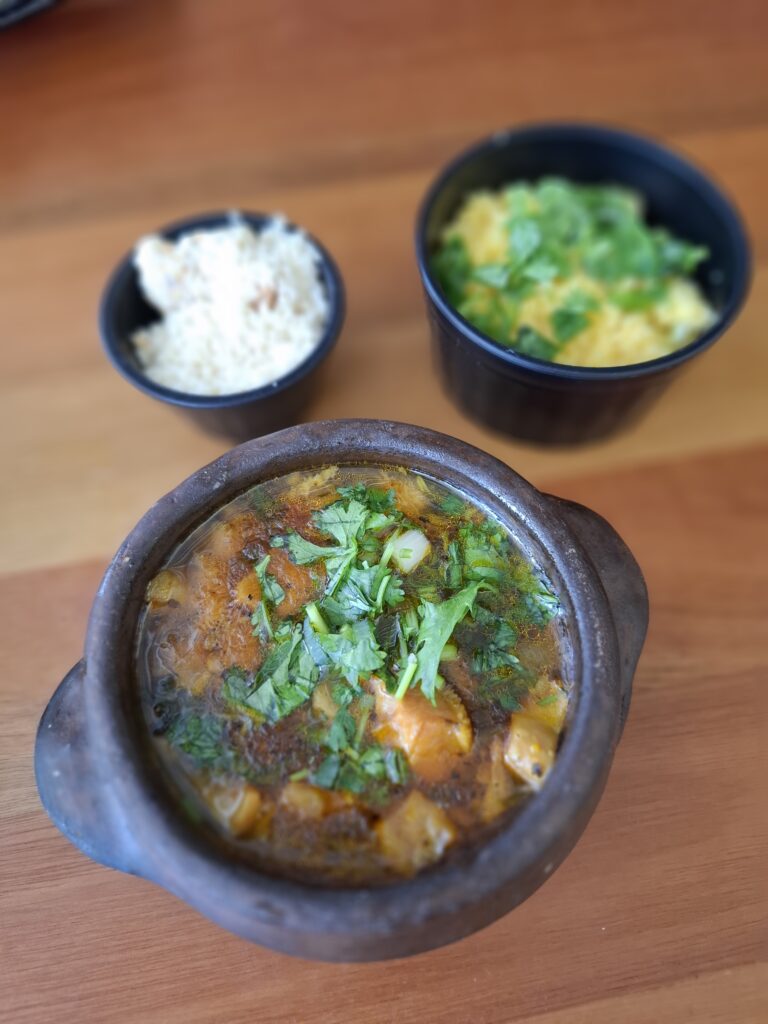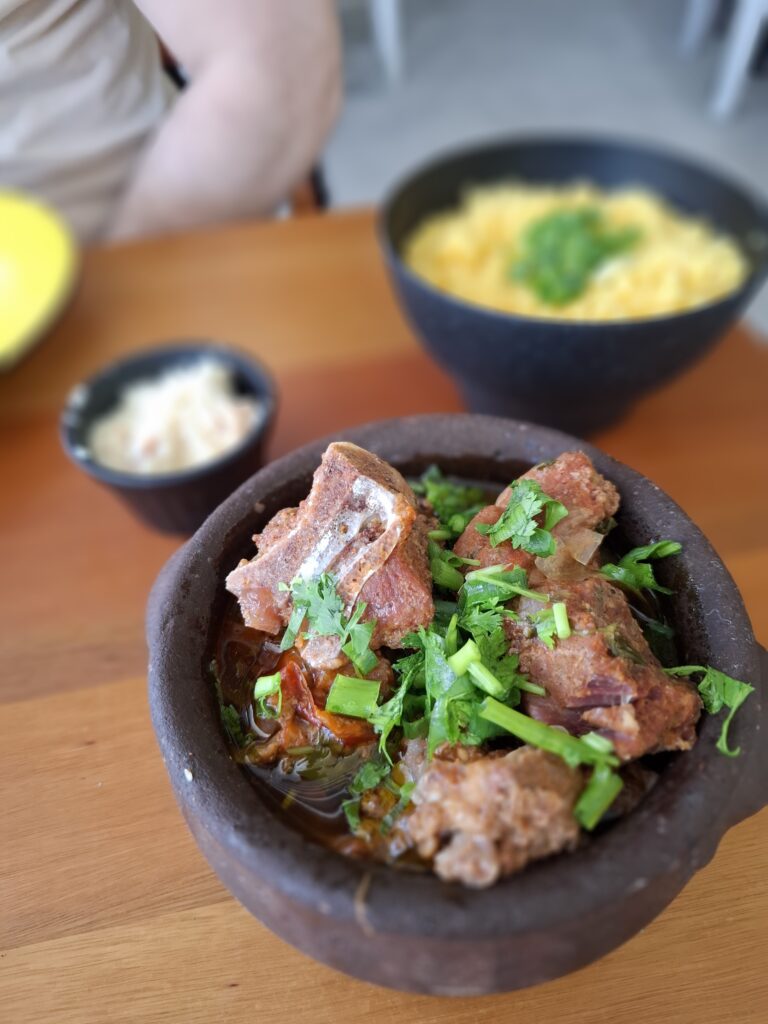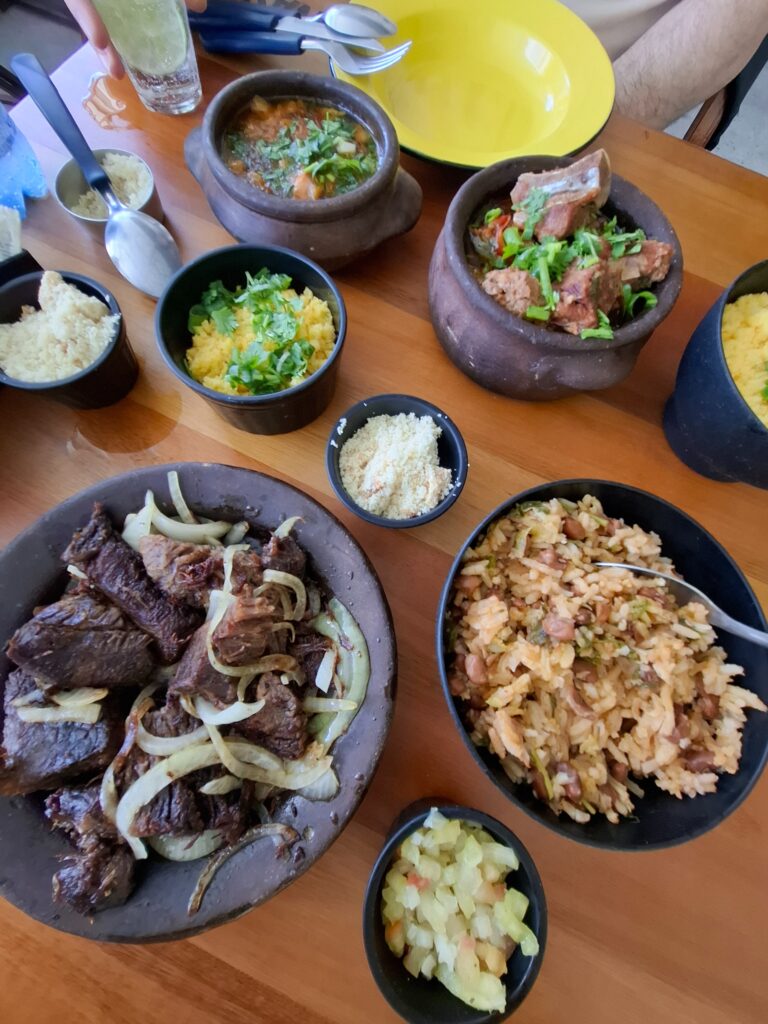 Os acompanhamentos, bem temperados, como baião, farofa de torresmo e cuscuz completam a experiência.