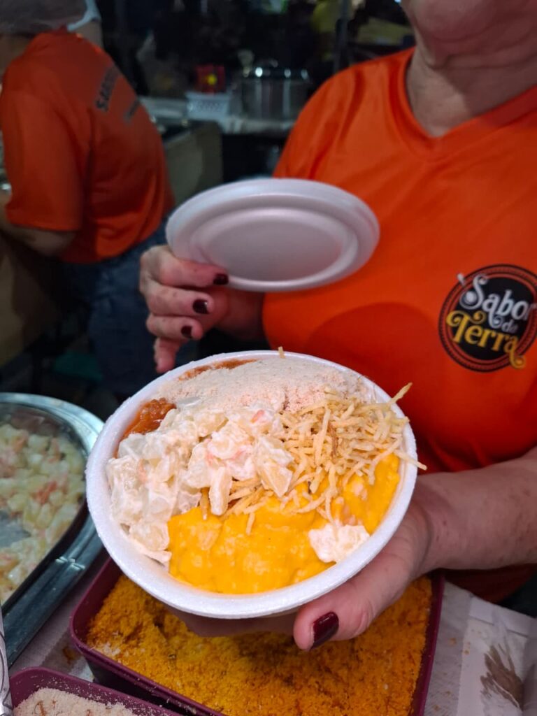 As vendas começaram há nove anos sob o comando de Samea Coelho. Tem pratinho por R$ 17 com quatro opções de proteínas e o de R$ 20 com sete. O cliente pode entre creme de frango, vatapá, strogonoff de carne, carne do sol, carne trinchada, lombo suíno com barbecue, calabresa e outras opções para montar o seu prato.