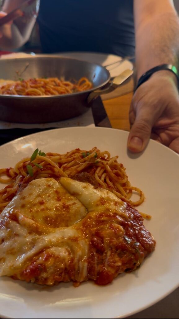 O Filé parmegiana para duas pessoas, por R$ 155, é uma opção para quem deseja dividir um prato bem servido. O prato traz o frango parmegiana gratinado com espaguete ao molho pomodoro Vignoli.