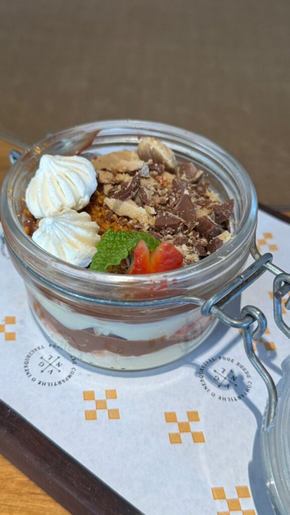 De sobremesa, o Potinho duo (R$ 28) apresenta uma combinação de creme de leite condensado, calda de chocolate nestlé, suspiros, bombom serenata de amor, morangos frescos e farofa de castanha.