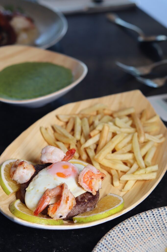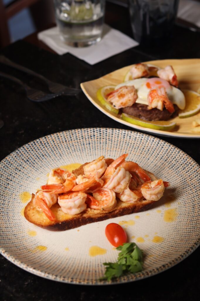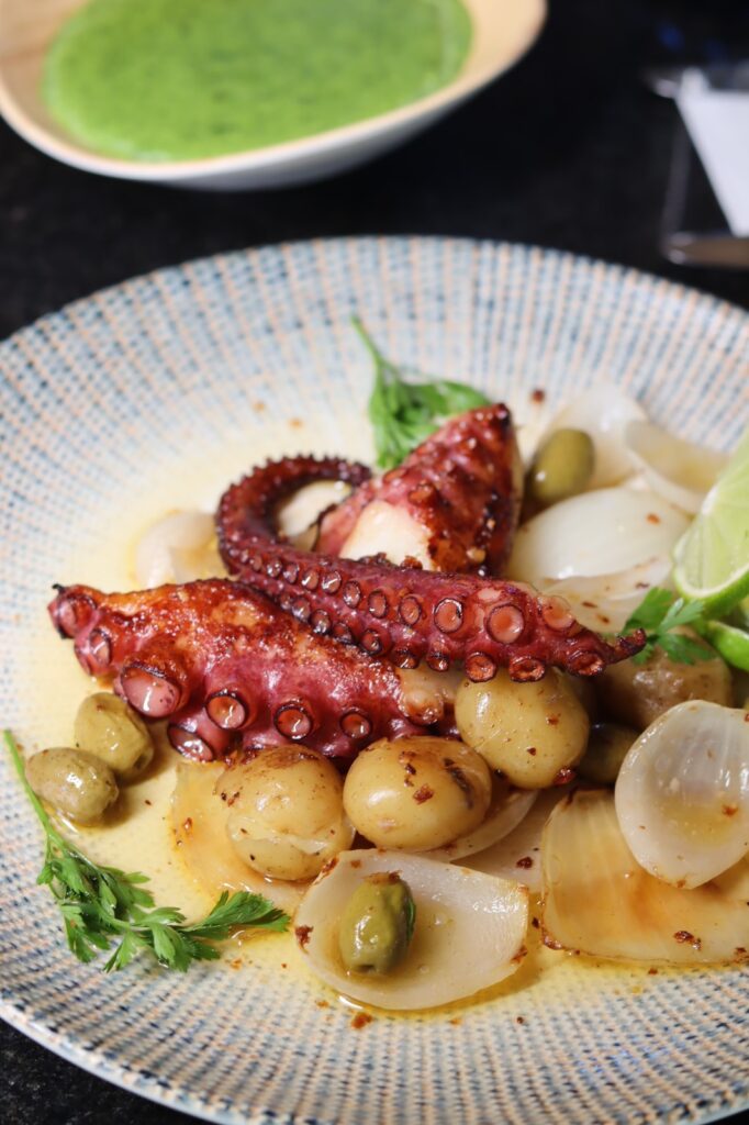 Duas entradas que merecem atenção são o Carpaccio de polvo e o Camarão salteado com azeite, alho e pimenta piri- piri). Na seção do pratos principais, o Polvo à lagareiro e o Filé sirigado com risotto de queijo coalho.