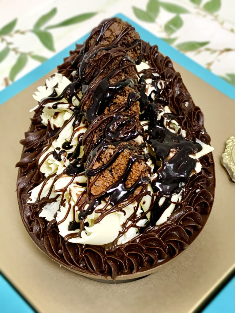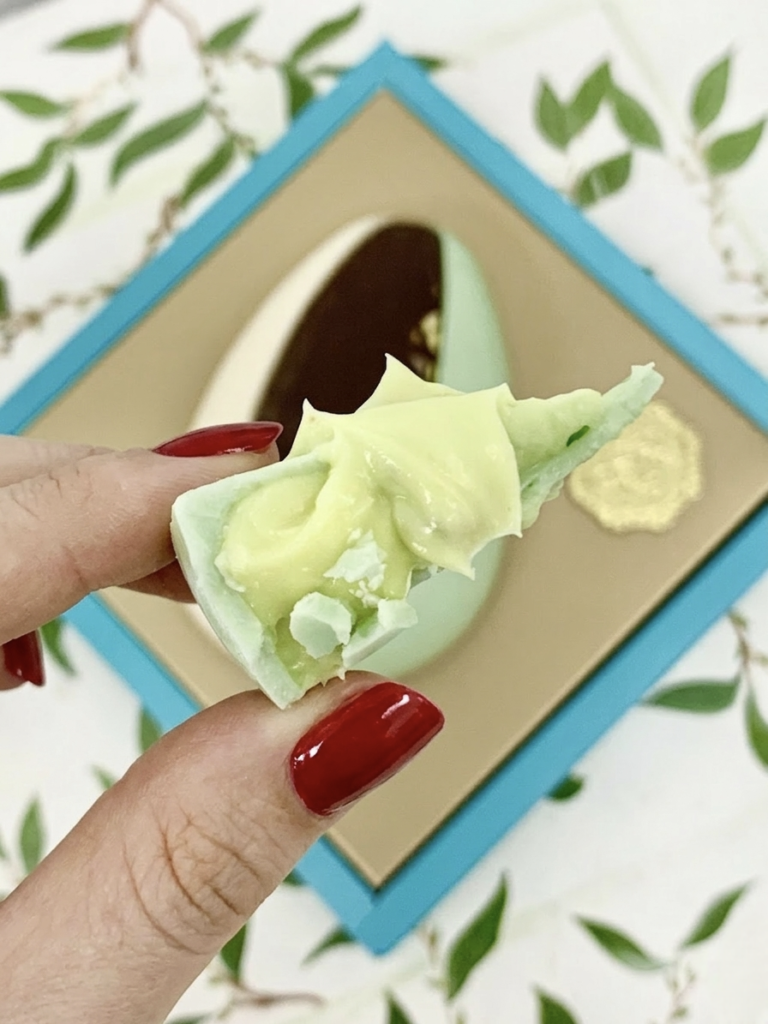 Casquinha de ovo de chocolate (ao leite e branco) dividida em três fatias. Cada pedaço recebe recheio individual. As opções de recheios são Nutella, chocolate branco, chocolate ao leite, pistache e geleia de frutas vermelhas. Tem 500g e custa R$ 149,90.