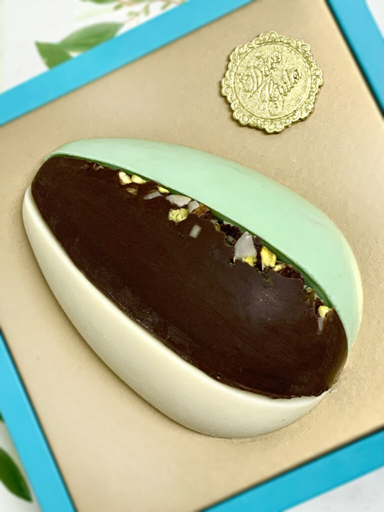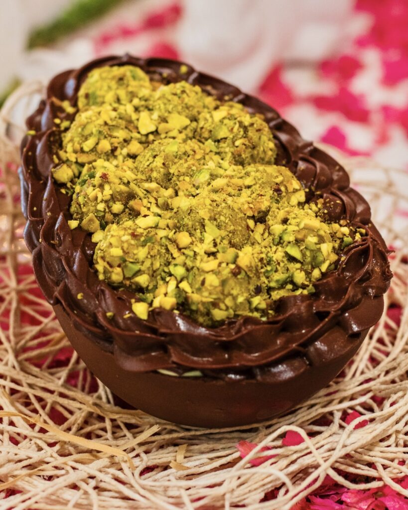 Casquinha de ovo de chocolate ao leite recheada com creme de pistache e ganache de chocolate. Finalizado com brigadeiros de pistache. Tem 500g e custa R$ 149,90.