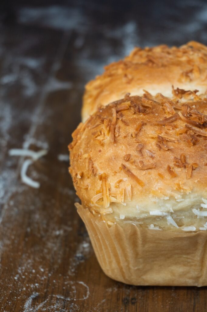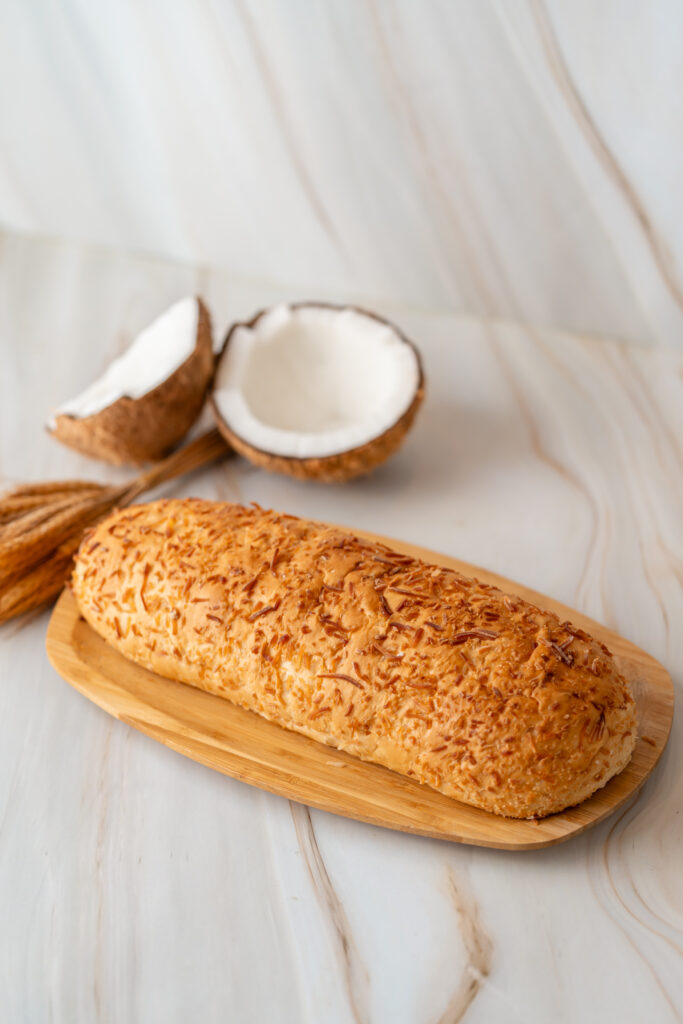 Pão de coco tradicional, leve e amanteigado, feito com coco fresco e leite de coco, além de um toque de mel. É doce e sútil no paladar. Está disponível para pronta entrega, vendido no formato mini na unidade, com valor de R$ 14,80. Também em tamanhos maiores, vendido no peso (valor de R$ 49,90 por kg).