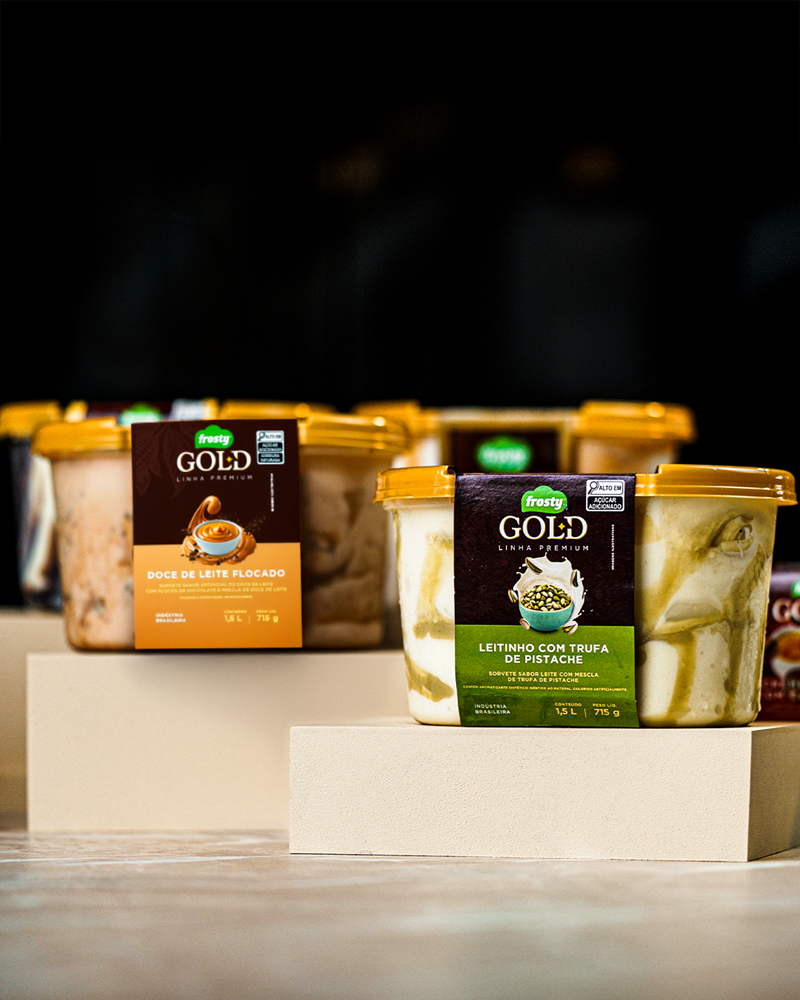 A Sorvetes Frosty lança, nesta sexta-feira (17), a reformulação completa da Linha Gold, que passa a contar com dois novos sabores: doce de leite flocado e leitinho com trufa de pistache. A atualização também chega aos demais produtos da linha, que foram revisados para ampliar a quantidade e a distribuição de recheios e mesclas, tornando a experiência mais marcante a cada colherada. Os itens estarão disponíveis em todas as lojas da marca.